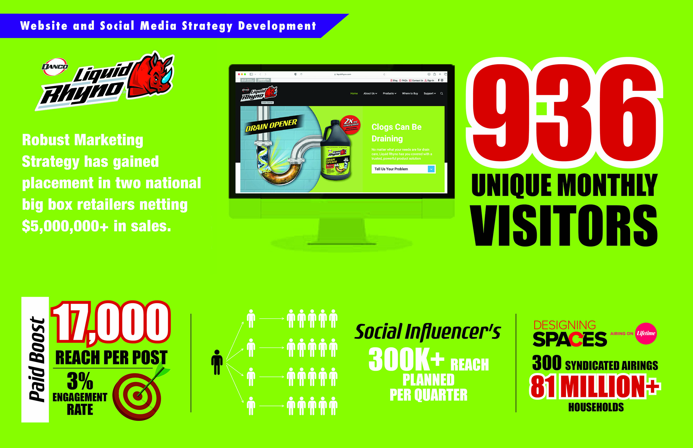 Liquid Rhyno entered a highly competitive drain-cleaning market needing immediate credibility, consumer awareness, and retail traction. Robust Marketing Strategy developed an integrated approach that combined website redevelopment, paid social amplification, influencer partnerships, and national television exposure. The website was redesigned to strengthen brand positioning and support retail conversations, generating 936 unique monthly visitors and servingDetails -