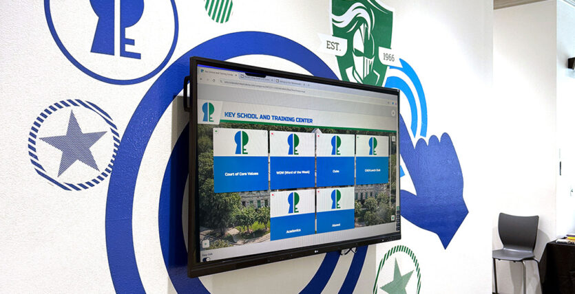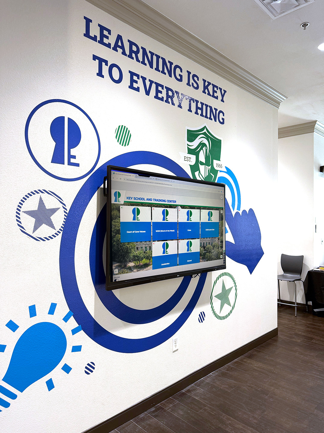 When Key School relocated to the newly renovated John M. Richardson Campus, the goal was to create an environment that was vibrant, engaging, and fully on-brand—a space where students could feel inspired while navigating their learning journey. I was brought on to design a suite of environmental graphics that would transform the media wall, pillars, hallway ceilings, and library walls into an immersive experience.